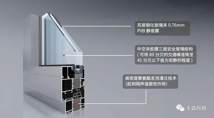 玻璃占整窗的80%。玻璃具有一定的穿透性,隔声性能很难达标。卡森佩格系统门窗针对不同需求的客户有针对性的选用隔声型材与不同工艺厚度玻璃组合。达到用户满意的隔声需求。隔声型材选用高性能五腔体断热材料,中间三个隔热腔体灌注密闭式闭口PU发泡起到隔声谐振低作用,使用双层钢化玻璃夹0.76mmPVB膜,经高温高压牢固粘合而成的隔声层玻璃,再配中空钢化玻璃做法,实现中空夹胶膜三层安全玻璃结构。可将80分贝的交通曝音降至45分贝以下极为安静的程度。声音在通过隔声窗的时候要通过很多层介质反射和消减所以隔音效果极佳。